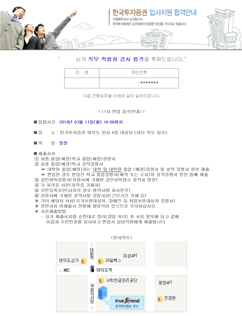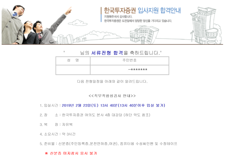 - 한국투자증권의 경우 전형별 '합격자에 한해서' 전형결과를 확인하라는 문자가 온다. 발표 시간이 다가왔는데 문자 안오면 얼마나 후달리던지...