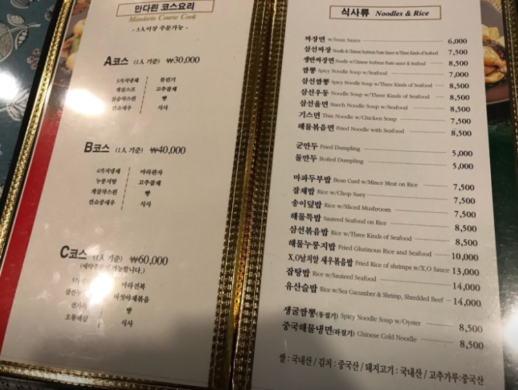 메뉴는 여느 중국집과 큰 차이가 없다. 차이점을 하나 꼽자면, 코스요리가 있는거? 보통 작은 동네 중국집엔 코스메뉴까진 없으니까. 그리고 가격이 합리적인 것?