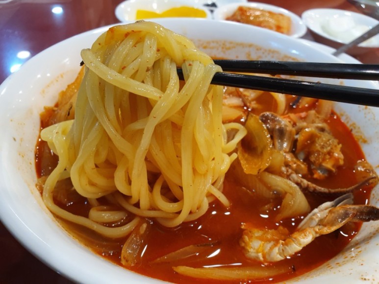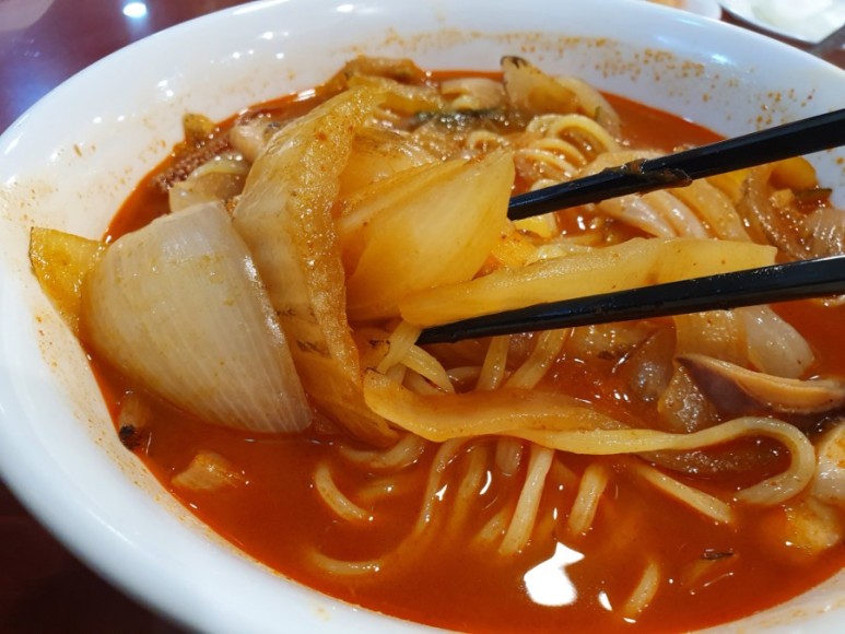 사진만 봐도 알겠지만, 양파가 또 굉장히 많이 들어가는 짬뽕이다. 이건 굉장히 기본적인 요소인데도 양파가 덜 들어가는 집들이 간혹 있다. 중식의 베이스는 기름과 양파인데 말이다. 양파가 만드는 단맛, 게, 문어 등의 각종 해물이 만드는 미쳐버린 국물은 식욕을 터트려버렸다.