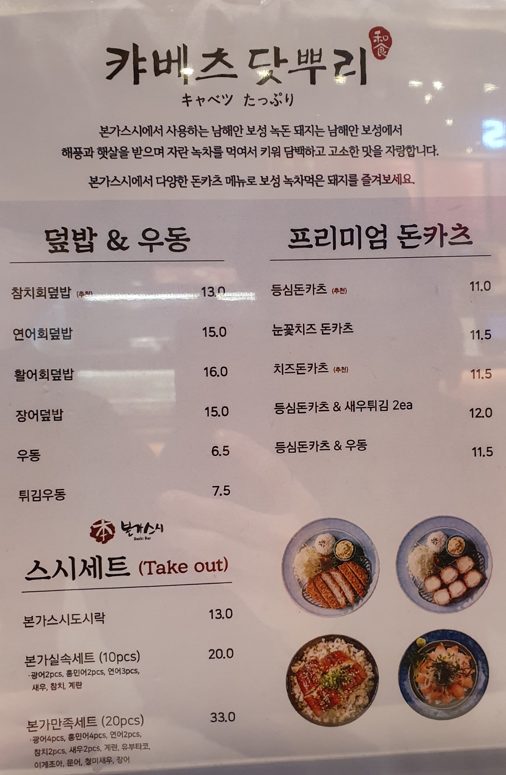 메뉴는 다음과 같다. 덮밥과 우동류, 돈까스가 메인으로 초밥도 판매한다.