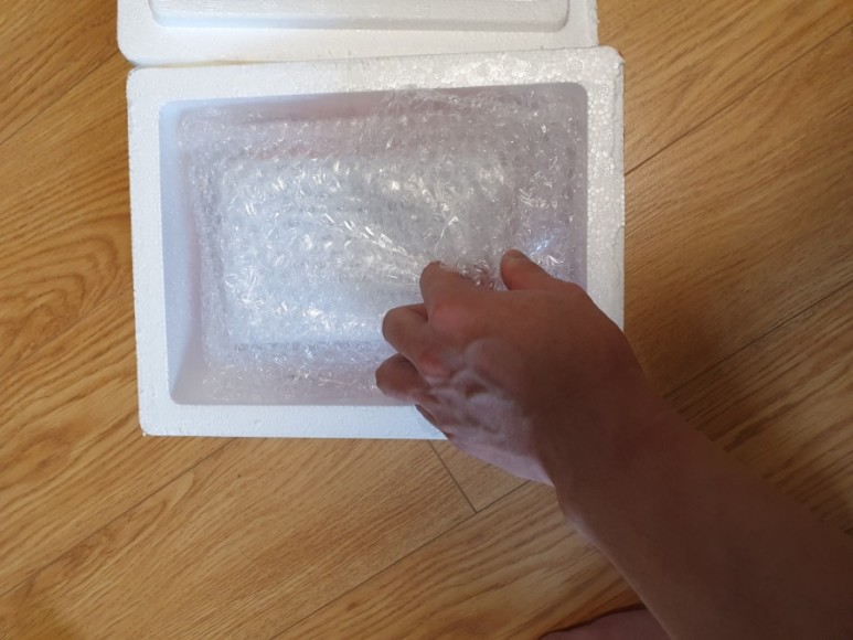 뭐 아무튼, 뜯어보고 선물임을 인식했다! 다시 기분좋게 개봉박두! 마카롱이 깨지지 말라고 뾱뾱이로 감싸져있고, 또 변질되지 말라고 아이스팩이 들어가 냉동상태로 온다.