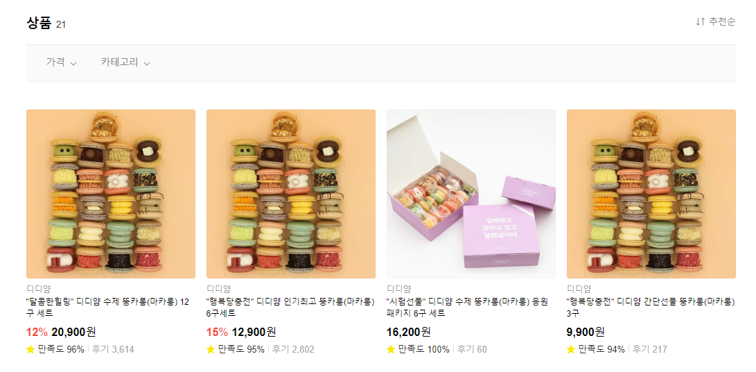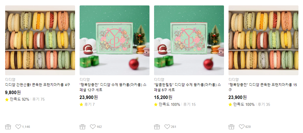 디디얌 카카오톡 선물하기에서 디디얌을 검색하면 아래와 같은 여러 상품들이 나온다. 내가 받은 선물은 아마 '디디얌 수제 뚱카롱 스페셜 6구 세트'였던 것 같다. 상품군을 살펴보니 15구, 12구 등 더 많은 구성을 가진 포장도 있으니, 적절한 예산과 마음가는 느낌 안에서 선물하면 될 것 같다.