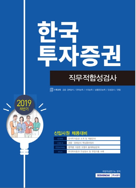 그렇게 직무적합성검사를 보러 갔다. 한투의 필기시험은 시간이 절대적으로 부족한데, 과목당 20문제 중에 13~15개 푼다는 각오로 임하면 될 것 같다. 연습 문제지로는 서원각 한국투자증권 직무적합성검사를 추천한다. 문제 형식도 비슷하고, 양도 많아서 이거 한권이면 충분하다.