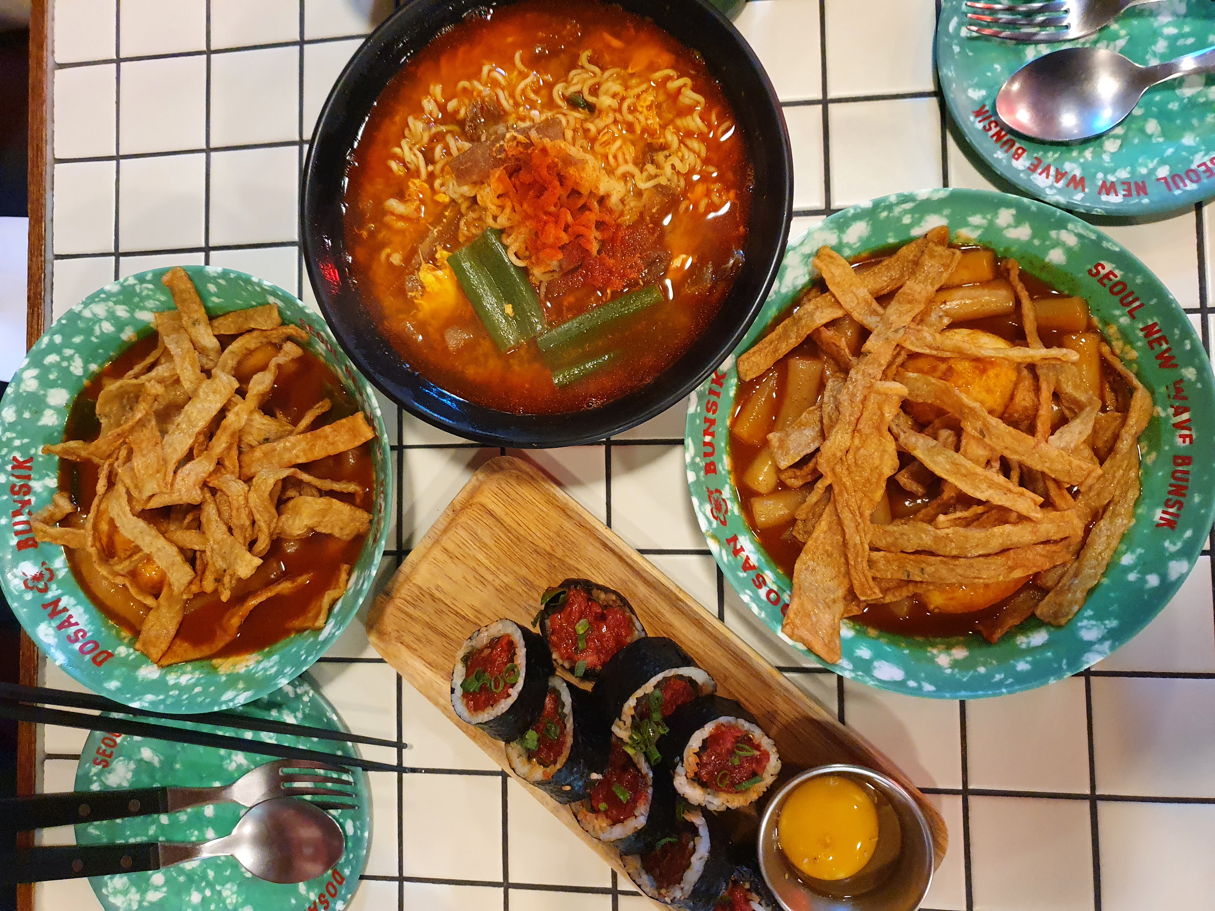 우린 떡볶이 1인분씩에, 육개장라면 1개, 육회김밥 1개를 주문했다.