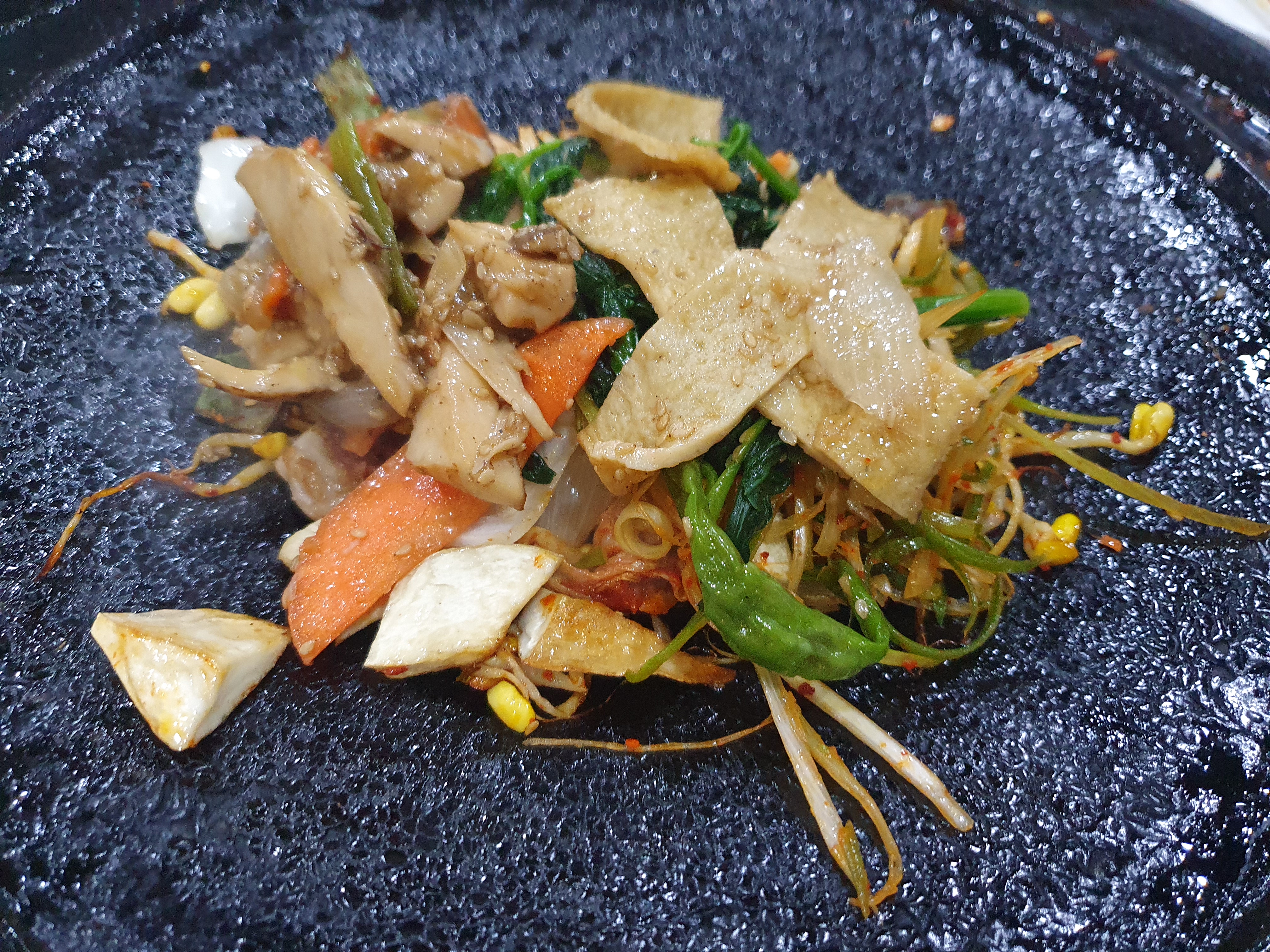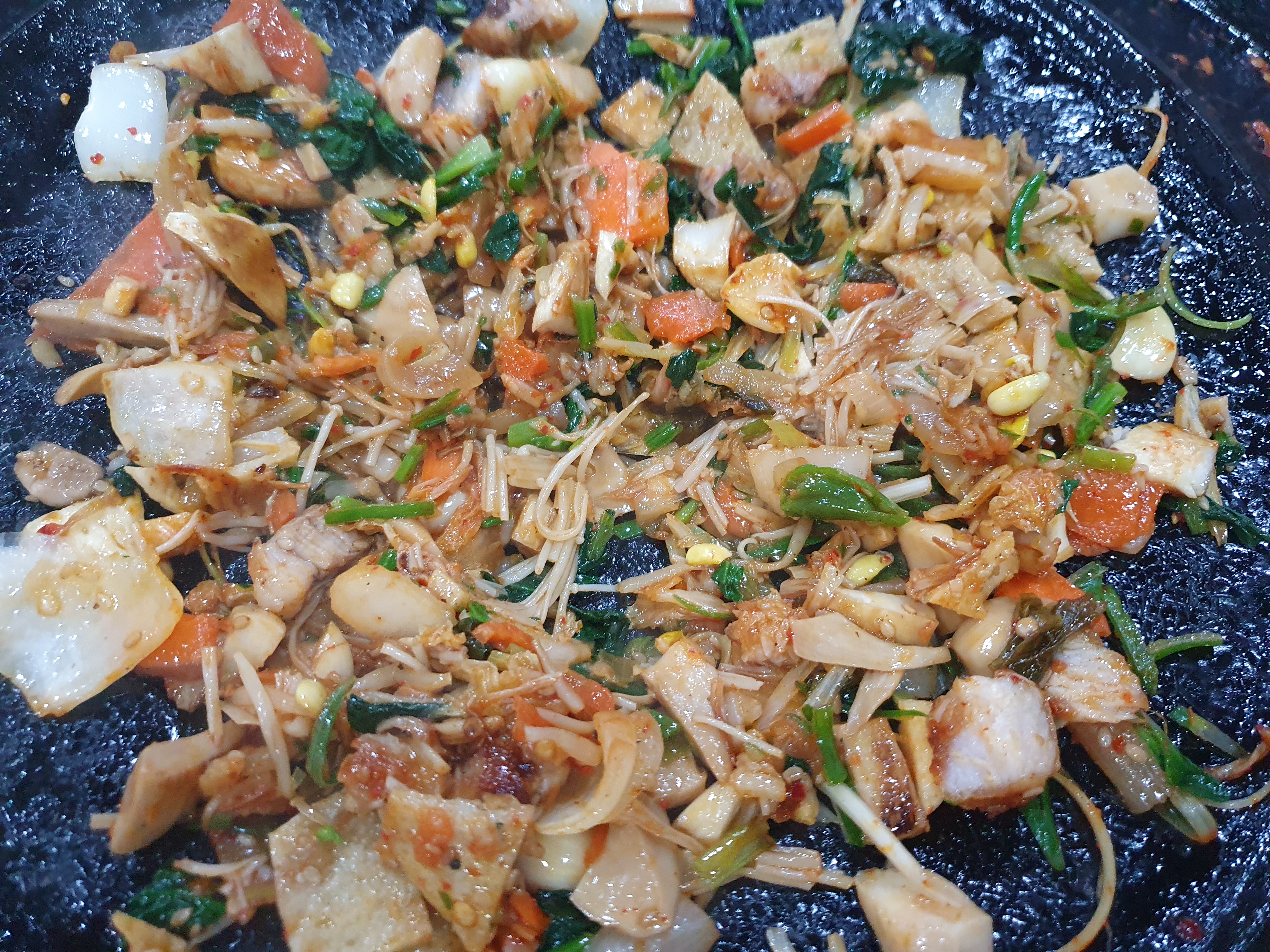 그렇게 모든 재료가 솥뚜껑 위에 올라갔다.