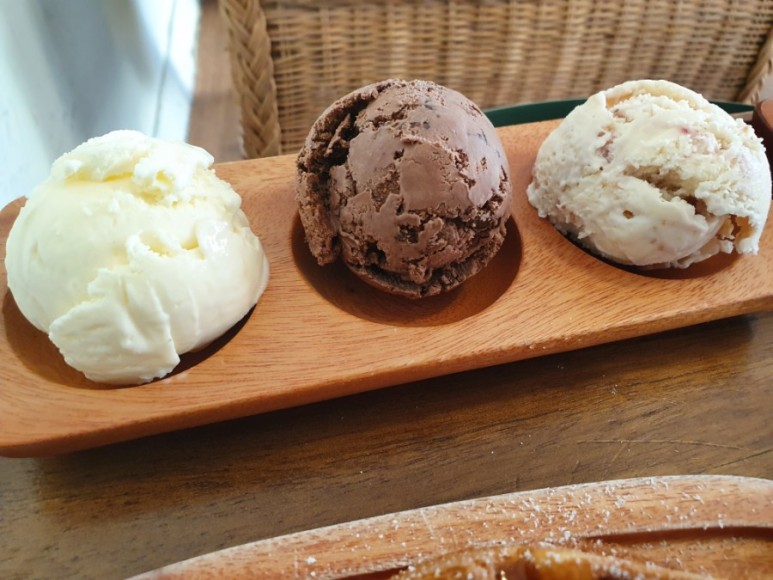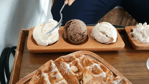 여기서 먹을건 당연히 아이스크림 와플! 아이스크림 맛은 3가지를 고를 수 있고, 와플이 함께 나오는 메뉴다.