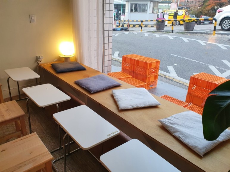 주황색 우유박스가 또 의자로써 어울리는 모습이다.