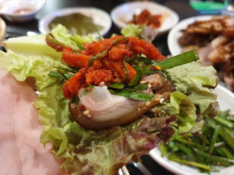 소주 한잔했으면 쌈을 크게 싸서 한입에 넣어준다.