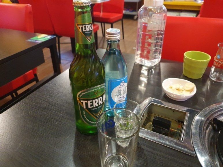 먼저 밑반찬과 진로, 테라가 나왔다.