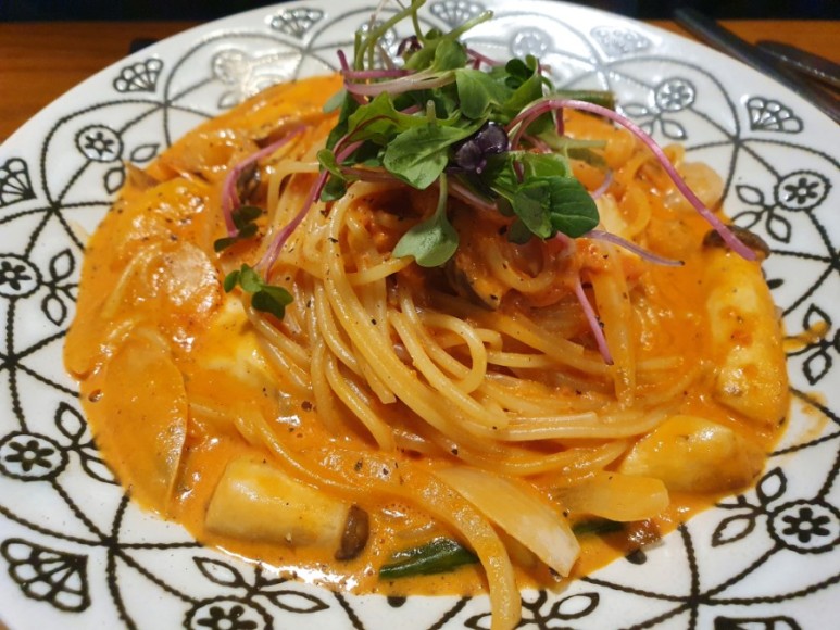 그리고 로제파스타도 주문했는데, 알리오올리오를 좋아하는 나와 달리, 소스의 풍미 가득한 맛을 좋아하는 아버지를 위해 주문했다. 당연히 꾸덕한 로제소스가 재료에 가득 베어 있었기 때문에, 버섯, 양파, 파스타면 가릴 것 없이 코와 입을 함께 만족시켜주었다. 아버지도 정말 맛있게 드셨다.