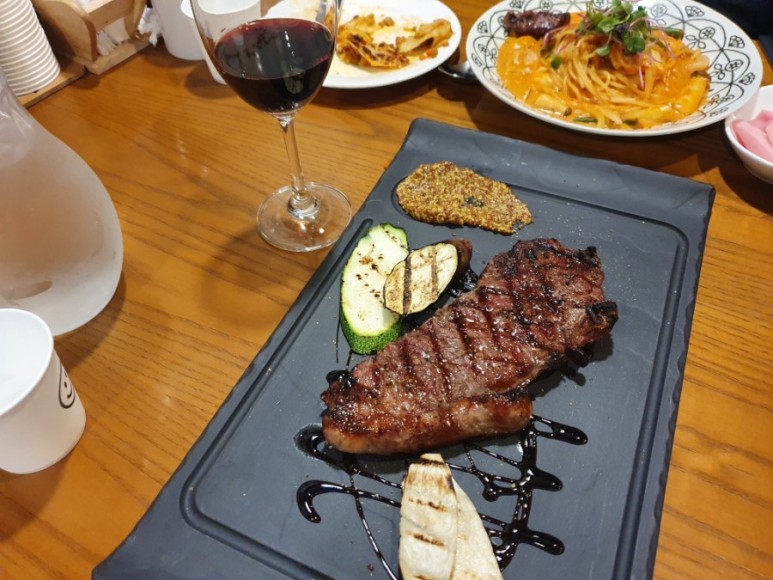 그리고 아버지 한덩이 드시라고, 채끝등심 스테이크를 따로 주문했다. 이 역시 굉장히 맛있었는데, 채끝 부위라서 그런지 내 스테이크보다 더 부드럽고, 기름기도 많아서 육즙이 팡팡 터지는 고기였다. 와인이 잘 어울리는 맛이었다.