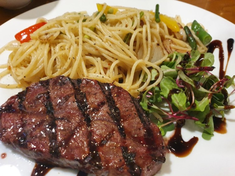 그리고 주문한 스테이크 파스타. 부채살 스테이크 + (토마토, 로제, 트림, 오일 중 선택) 파스타의 메뉴이다. 난 오일을 좋아하기 때문에 오일 파스타로 주문했다. 스테이크의 석쇠 자국이 뭔가 더 군침 돋게 만드는 비주얼을 지니고 있다. 스테이크의 단면을 찍지 못하고 먹기 바빴지만, 미디움 레어로 요청했었기 때문에 적당한 식감과 함께 오일 파스타를 즐길 수 있었다. 그리고 먹을때마다 느끼는 거지만, 스테이크는 기본이 제일 맛있다!