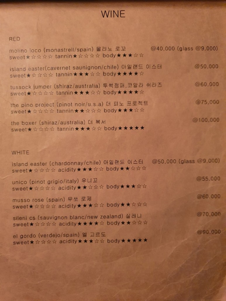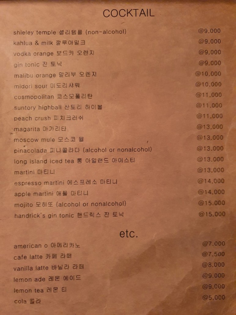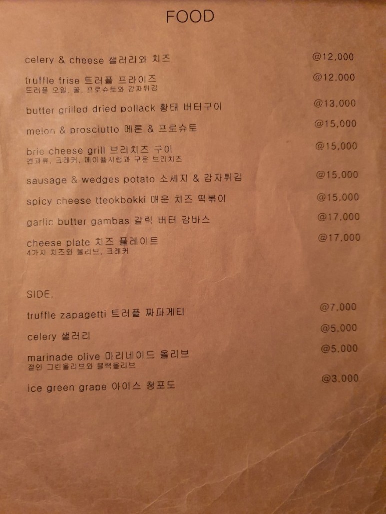 맥주, 칵테일, 위스키, 와인, 그외 음식(안주)