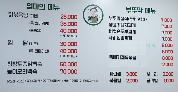 메뉴는 닭볶음탕과 찜닭 그리고 백숙을 취급한다.