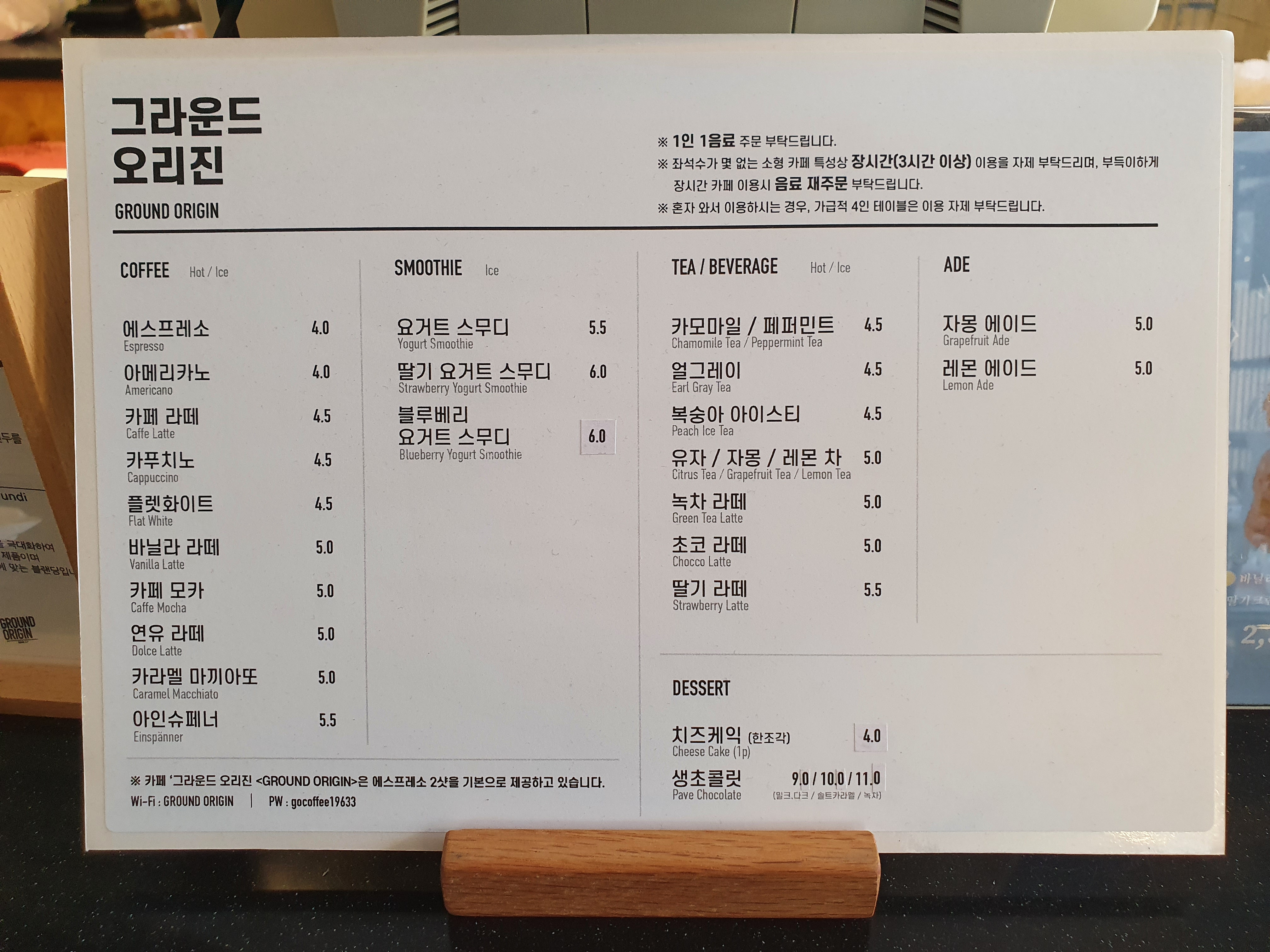그라운드 오리진의 메뉴는 아래와 같다.