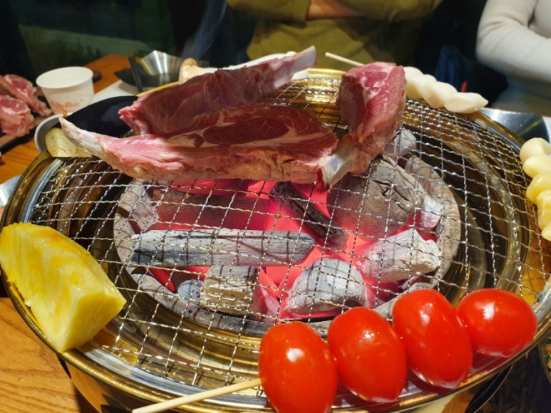 숯불위엔 양고기 뿐만 아니라 파인애플, 방울토마토, 버섯, 가지가 올라간다. 모두 구우면 맛있는 재료이면서, 고기와 함께 먹어도 밸런스가 좋은 그런 재료들이다. 물론 파인애플은 호불호가 갈리는 음식이긴 한데.. 일반적으로 스테이크 구울때도 함께 활용되는 좋은 재료이다.