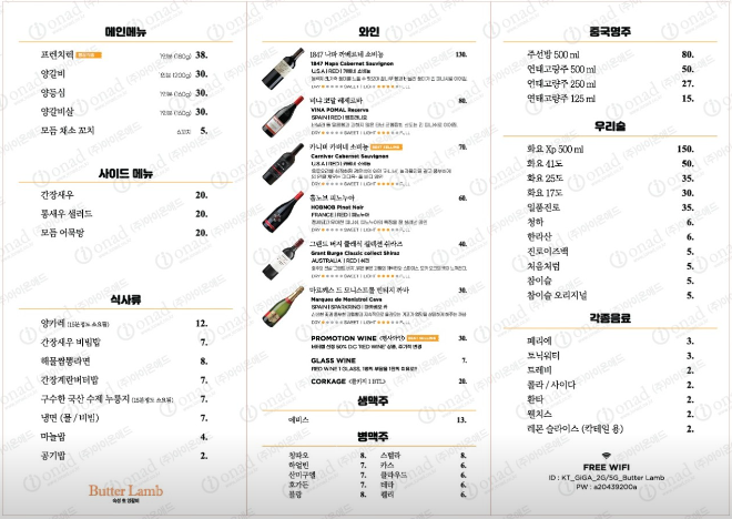메뉴는 아래와 같다. 프렌치렉이 시그니처 상품이고, 그 뒤를 양갈비, 양등심이 잇고 있다. 식당의 불판과 메뉴판을 봐서 알겠지만, 이곳은 양꼬치를 취급하지 않는다. 대신 여러 와인과 중국 고량주, 국내 증류주를 취급하는 고급 레스토랑에 해당한다.