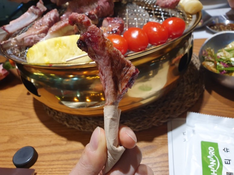 직원분께서 양갈비를 맛있게 구워주시는데, 뼈에 붙은 살도 야무지게 먹을 수 있도록 마지막에 뼈 부분을 휴지로 말아 손잡이를 만들어주신다. 아주 센스있다. 그리고 또 좋았던점은 미디움레어로 정말 잘 구워주신다는 점이다. 양고기는 소고기처럼 오래 구우면 질겨지는데, 딱 식감 좋은 정도로 만들어 주셨다.