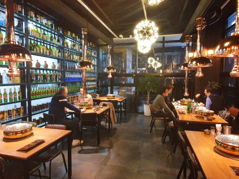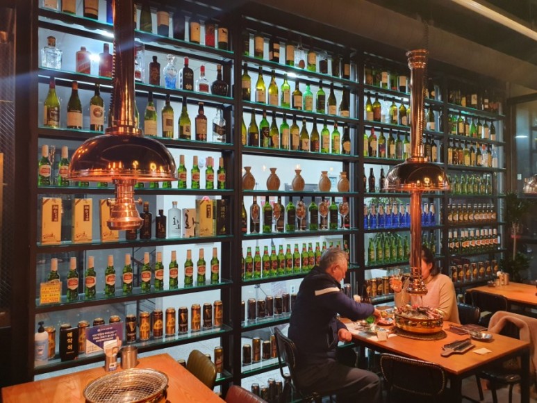 가게 분위기는 저녁 식사에 어울리는 주황빛이라 생각하면 되겠다. 따뜻하고, 온화하다. 그리고 양고기는 고량주 혹은 소주와 뺴놓을 수 없는 고기인데, 그걸 잘 표현하듯 술병으로 벽이 이쁘게 장식되어 있다.