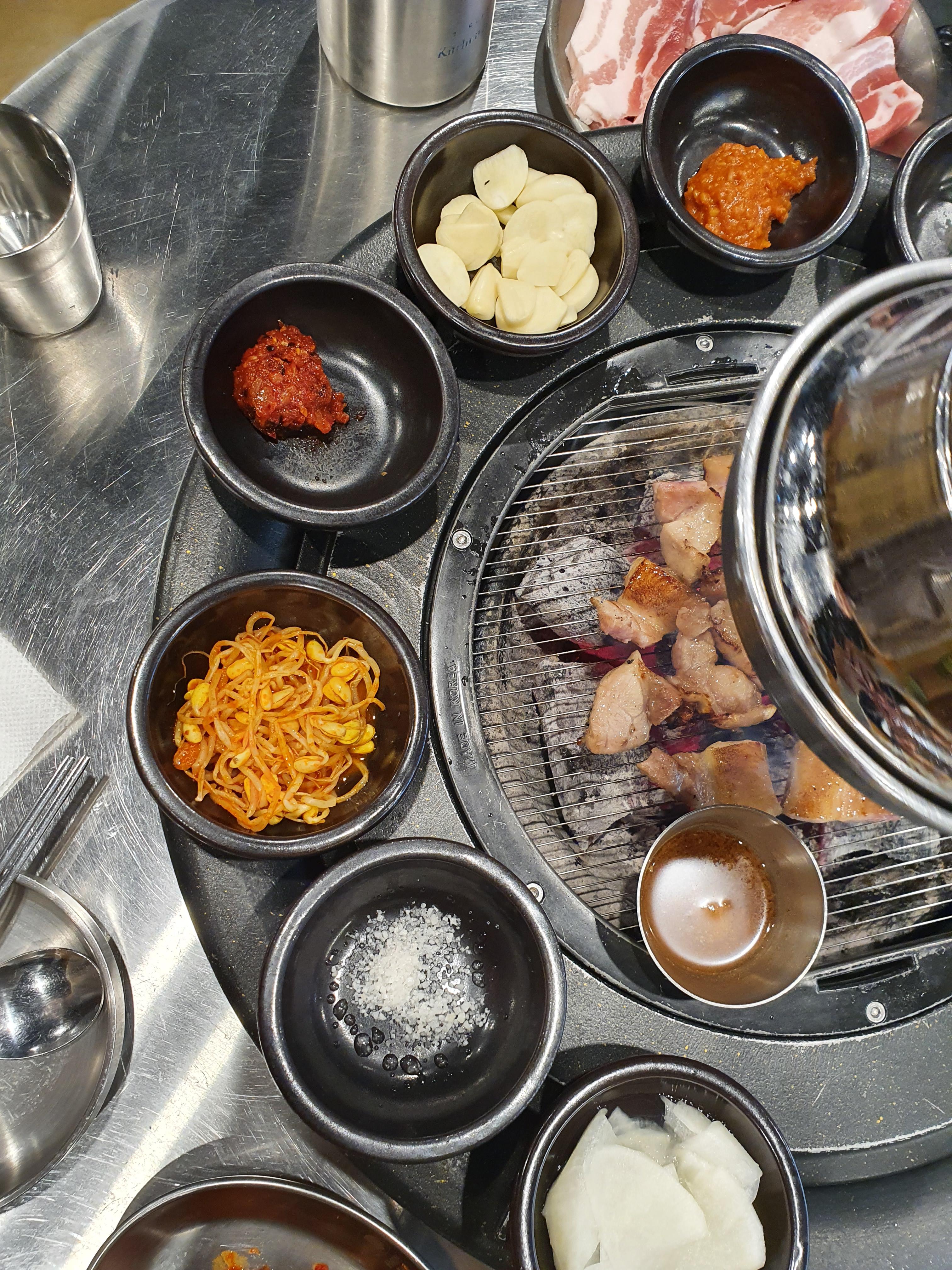 불판 주변으로 쌈장, 마늘 등이 놓이는데,