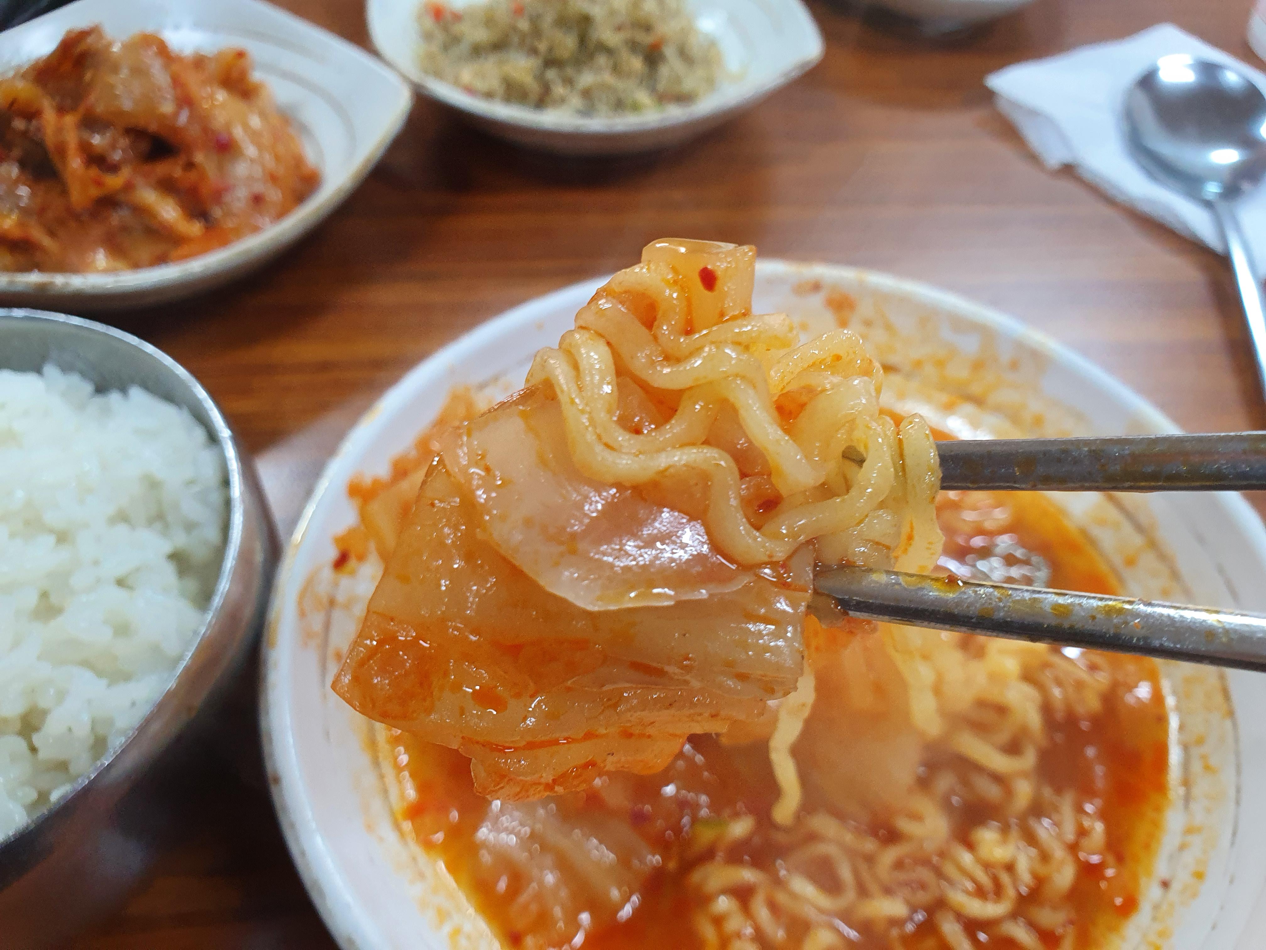 얼큰한 국물을 머금은 라면과 김치는