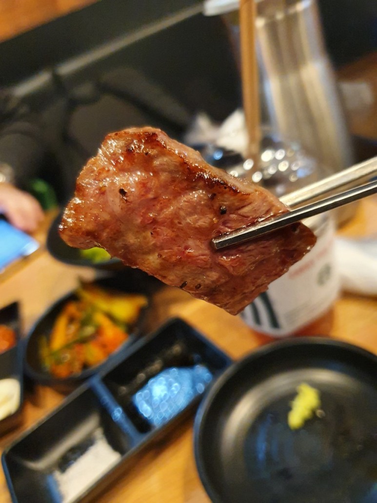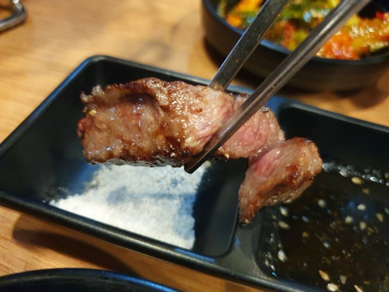 그렇게 먹음직한 소고기는 뜨거운 불판위에서 금방 익는다. 때문에 부드러운 소고기를 즐기려면 너무 오래 굽지 않도록 주의해줘야 한다. 적당한 한쪽을 구웠을때 절반정도 살이 익는게 보일때 뒤집어줌면 아주 훌륭한 소고기를 맛볼 수 있다. 그리고 이런 맛있는 소고기는 별도의 양념이 필요없다는걸 소금 찍어먹으며 톡톡히 느낀다.