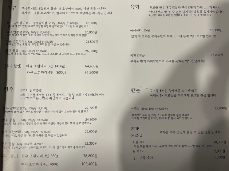 구이몽의 소고기가 나에겐 그런 가성비 식사였다. 매번 먹을 수 없는 소고기지만, 이정도 가격이면 소비할 수 있는 가격이면서, 이런 멋진 퀄리티의 고기가 나온다니, 지인들과 오랜만에 맛있는 소고기를 양껏 먹고 싶다면 정말 추천한다.