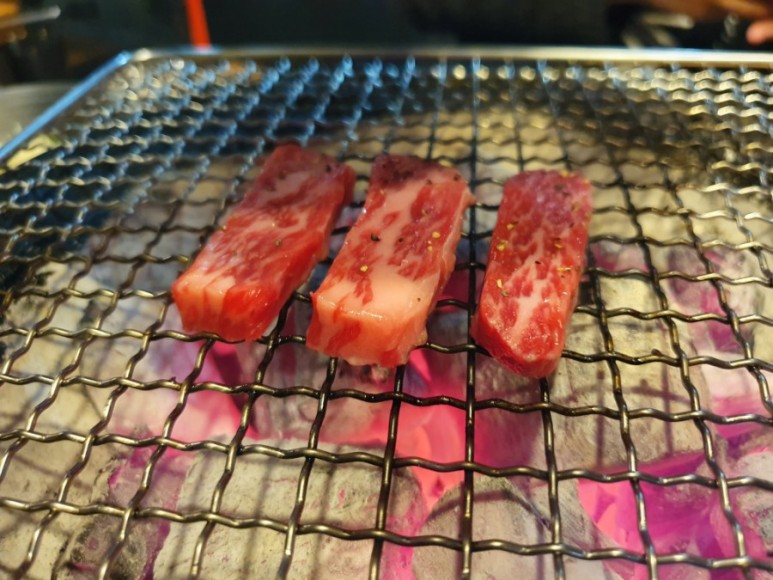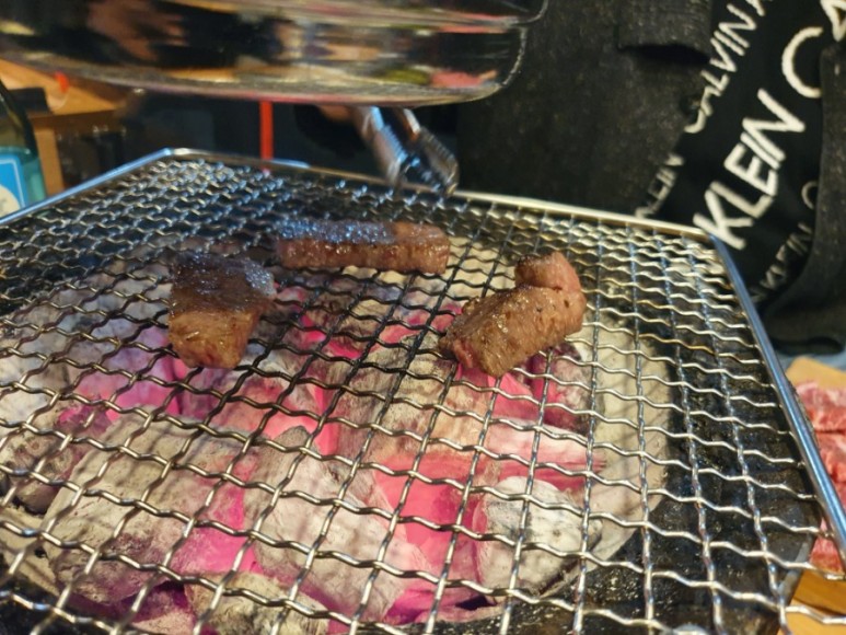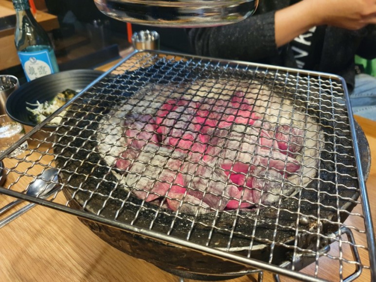 주문이 완료되면 아래와 같은 작은 불판이 나온다. 질좋은 숯이 고루고루 달궈져 빼곡히 찬채로 나오며, 바로 고기를 구워먹을 수 있는 상태이다. 오랜만에 소고기를 맛볼 생각하니 불만봐도 입에 군침이 싹 돌기 시작했다.