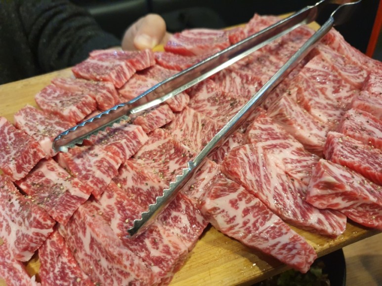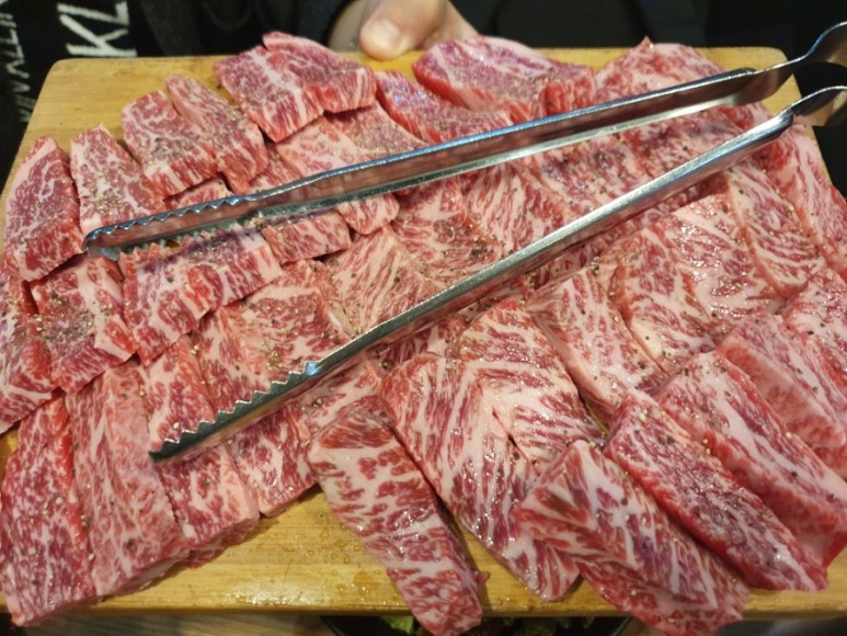 그리고 한우 소한마리가 나왔다. 왜 한마리였을까 하는 의구심을 싹 해결해주었다. 적당한 사이즈의 도마위에 한입 크기로 썰은 소고기가 환상적인 마블링 자태를 뽐내며 가지런히 놓여있다.