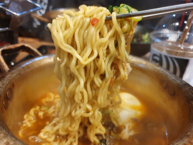 햐, 소고기가 들어간 라면은 국물의 깊이가 또 깊어지는 매력이 있었다. 고깃집의 센불로 끓인 라면은 면발도 탱탱함 그 자체이지만, 중간중간 라면과 함께 입안에 들어오는 소고기가 또 일품이었다. 최고의 선택이었다.